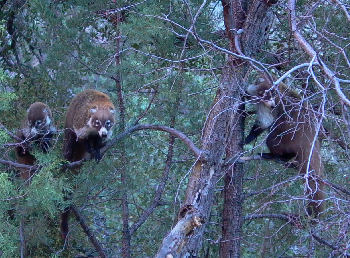 We came across this family group of Coati while driving down Cave Creek Canyon. We saw a medium-sized animal with a long tail run across the road ahead. Driving slowly to the crossing point we could see it in the long grass on our left. After a coupel of minutes we saw two more but couldn't get a good view. At this point we looked to our right and realised that the trees were filled with about thirty lovely animals we later learned were coati.