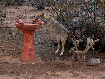 Putting out water in the desert is a sure way to attract wildlife. Coyotes usually appear around dusk and visit the village at night but this one called for a drink from the birdbath in broad daylight. Photograph by Jack Newton.